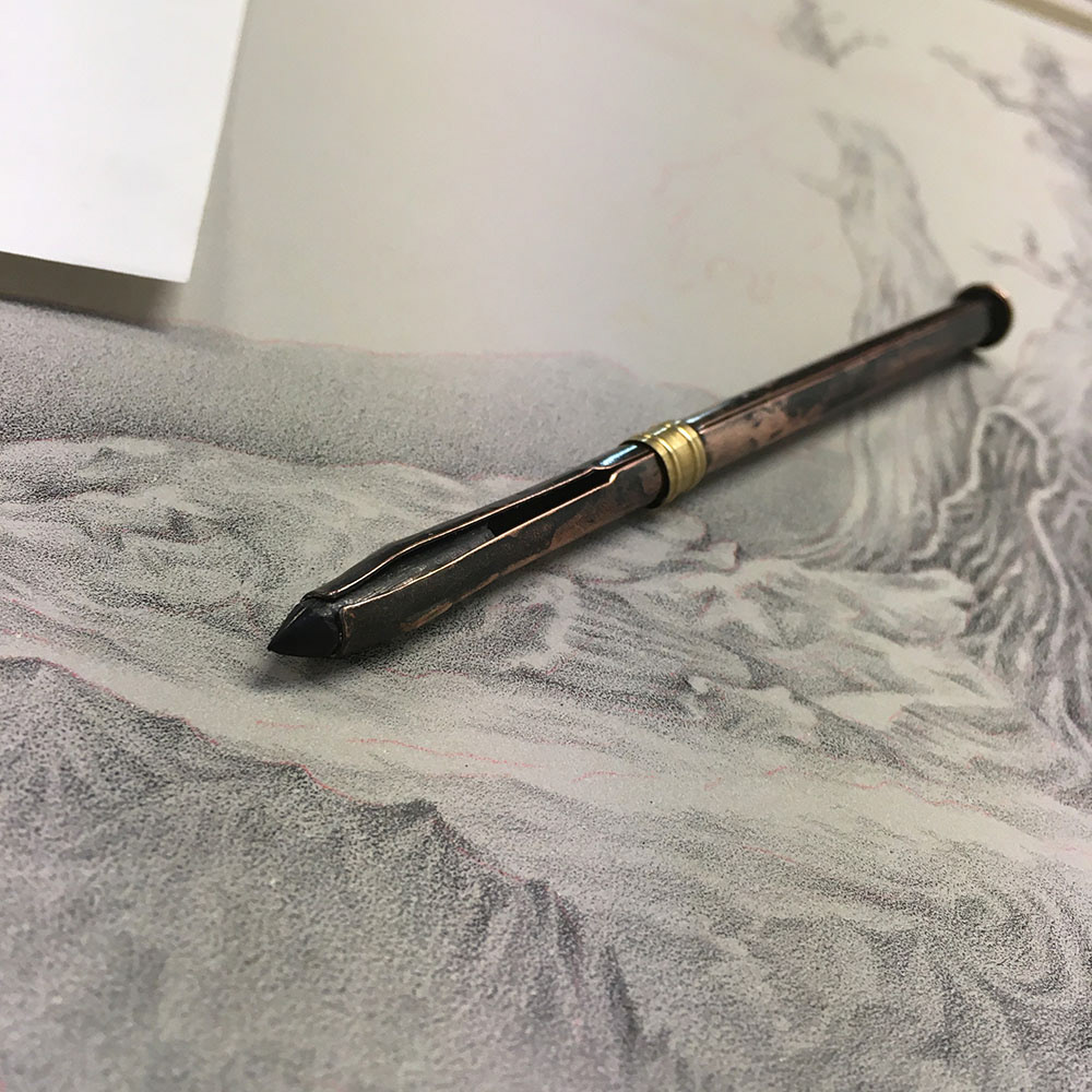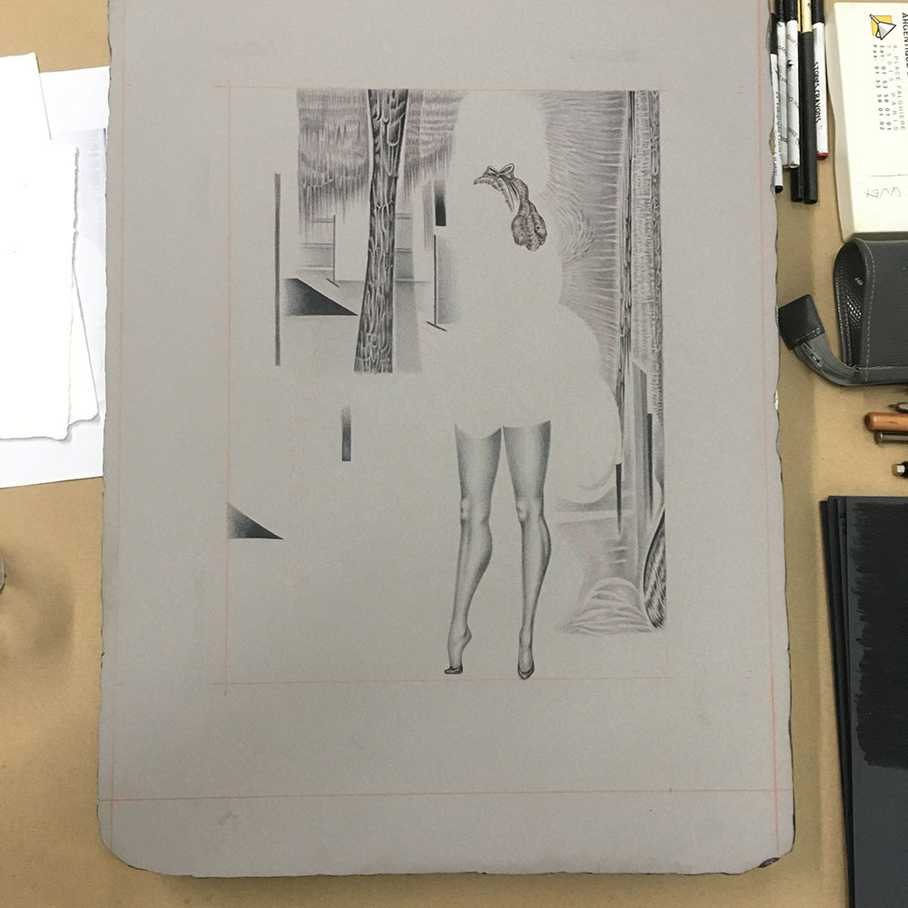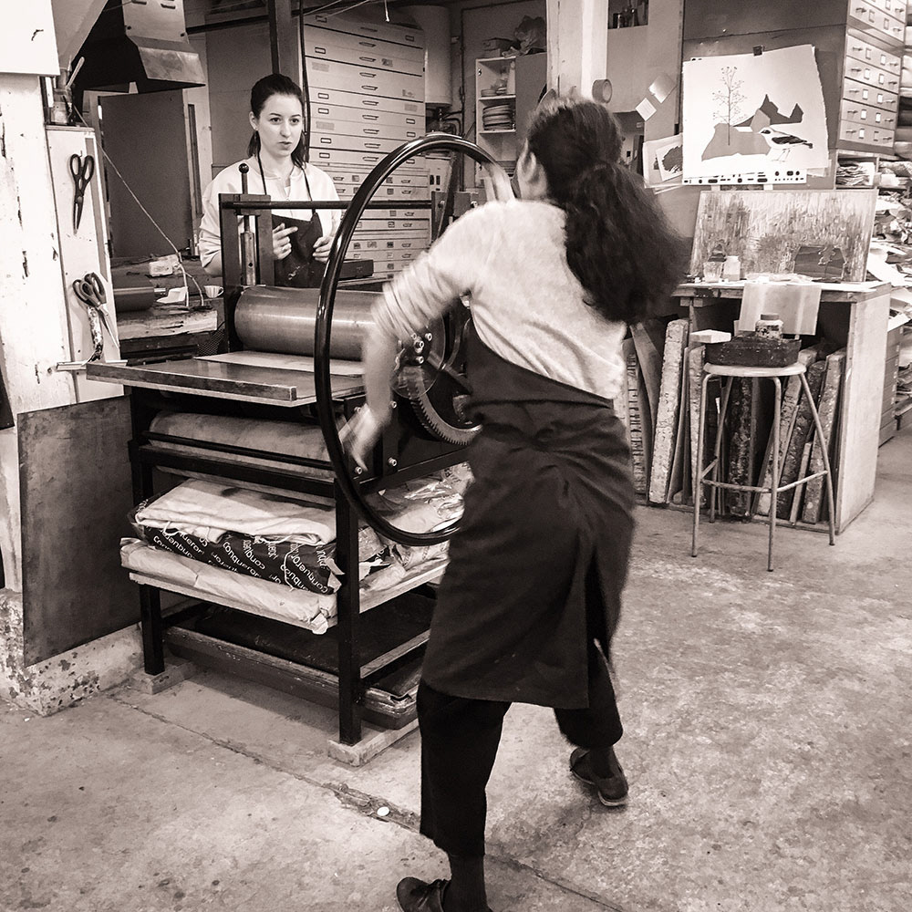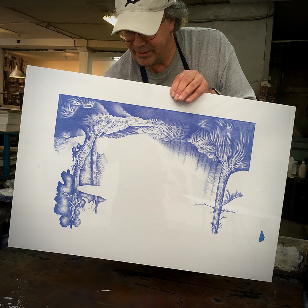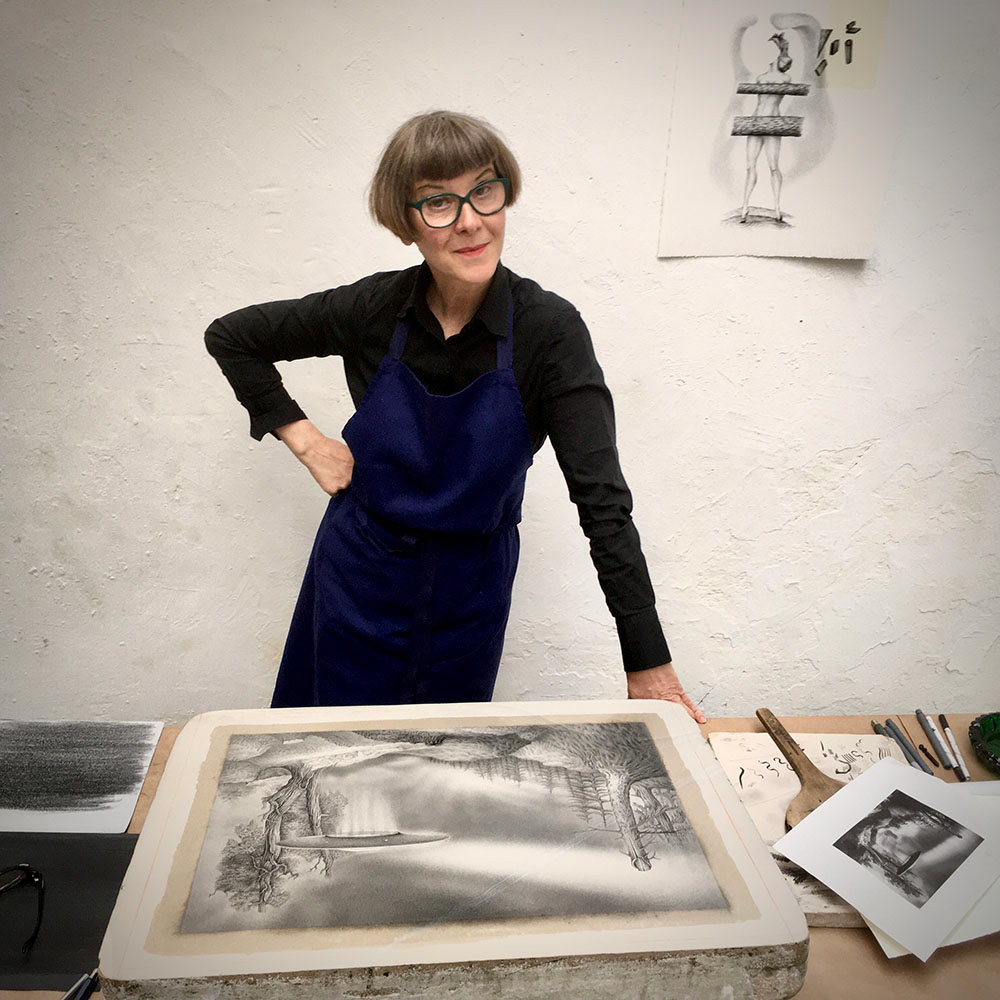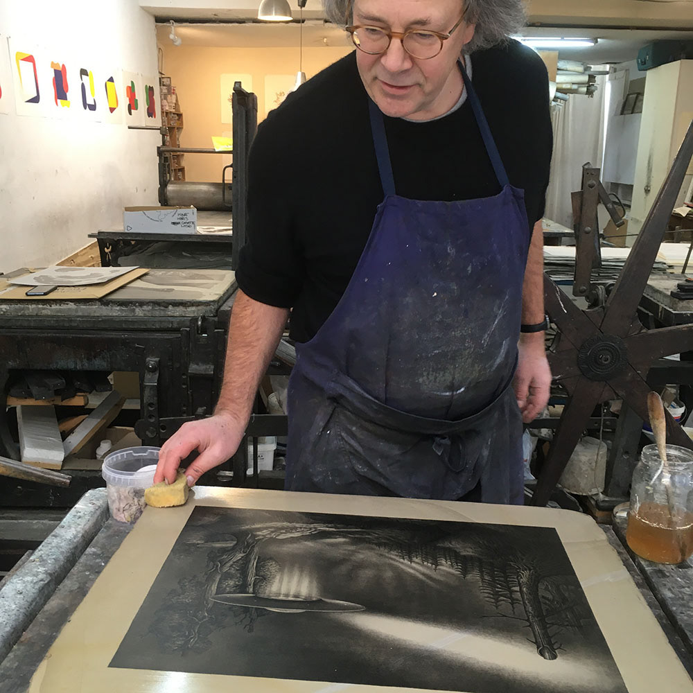 En 2019 Michael Woolworth m'invite à réaliser une première lithographie dans son merveilleux Atelier de la rue de la Roquette à Paris. Je découvre une nouvelle façon de dessiner au contact de la pierre lithographique, et le grand plaisir de travailler avec Michael et toute l'équipe de l'Atelier. Depuis nous continuons les expériences et avons réalisé un triptyque et un "paysage avec soucoupe" décliné en trois phases. En 2024 Michael m'invite à expérimenter un nouvel univers, la gravure sur cuivre. Une première impression est réalisée et l'aventure va continuer !